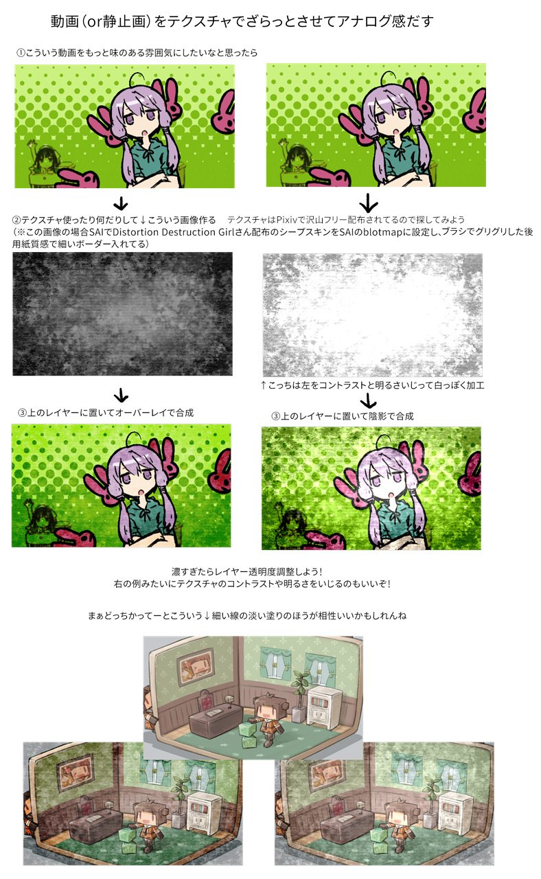 自分好みの雰囲気になるまでフリー配布テクスチャ(ブラシ)探して模様や色や色の濃さや透明度試行錯誤してみるといいんじゃないですかね!