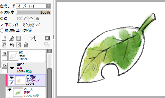 塗りの端付近を濃い色にするとリアル水彩っぽくなります。