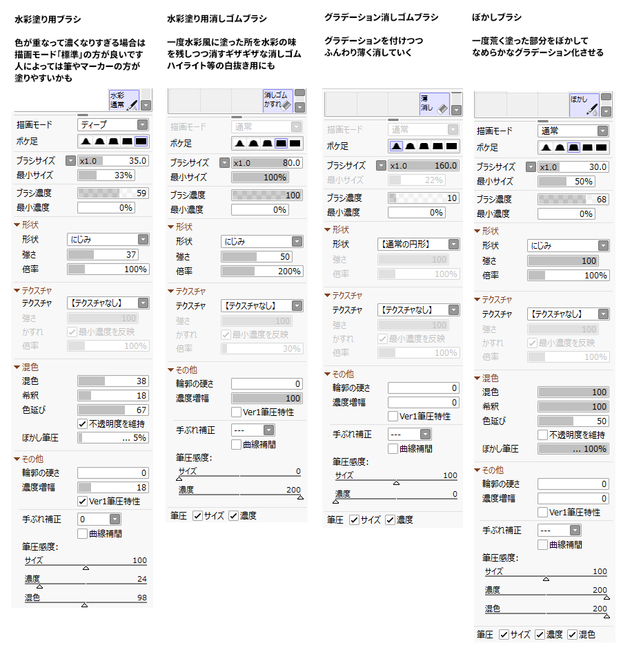 自分のブラシ設定はこんな感じ(あまりこだわりのない適当設定なのでそんなに厳密に参考にしなくて大丈夫です)