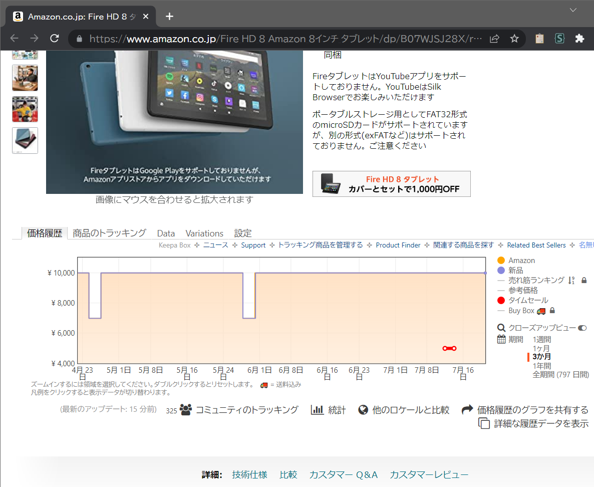 Amazonの商品ページ上に価格履歴等のグラフを直接追加表示してくれます。