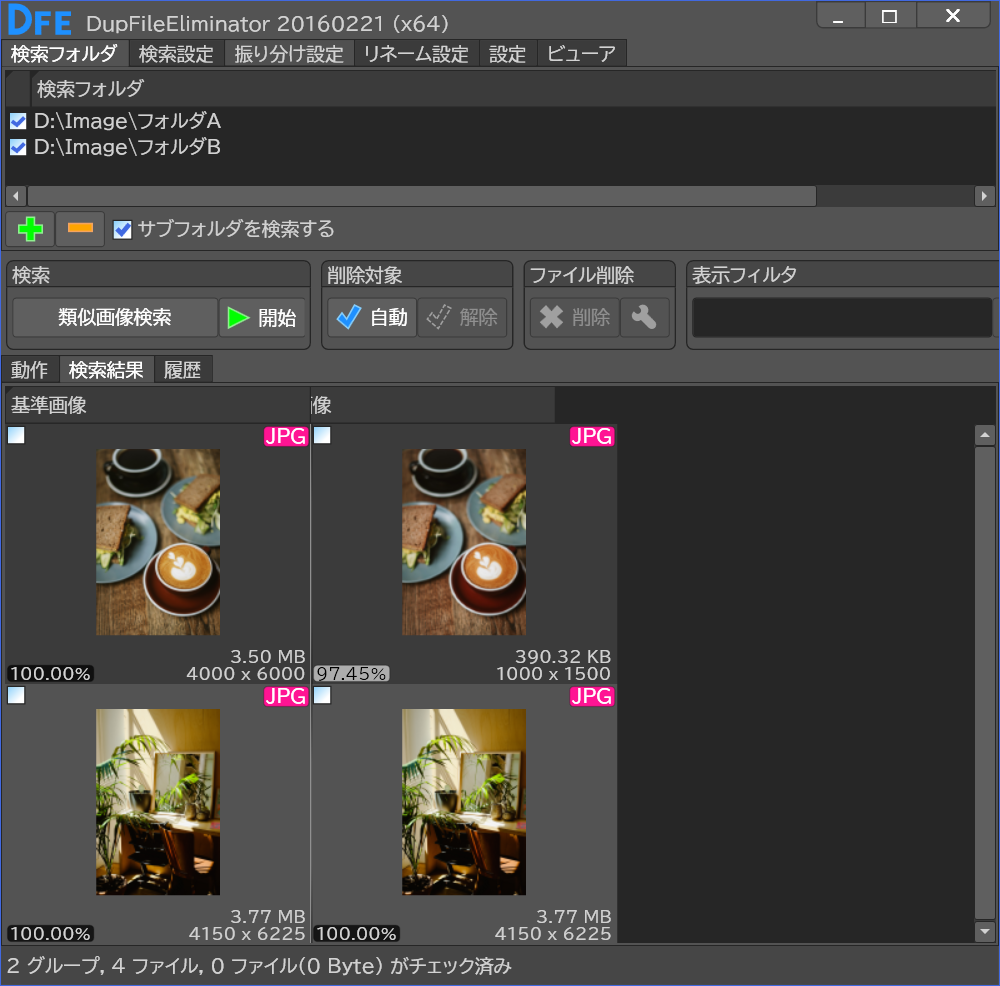 検索結果から自分の目で画像やプロパティを見て比較して好きな方のファイルを手動削除できるので安心。