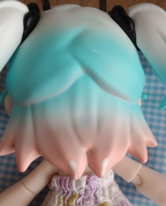 ちなみに頭の髪飾りや結った髪も固定されていて動かしたり外したりできません。この辺りのパーツは外す事を前提に作られていないため外してもデコボコした白い跡が残るようです。