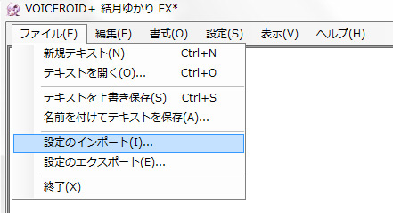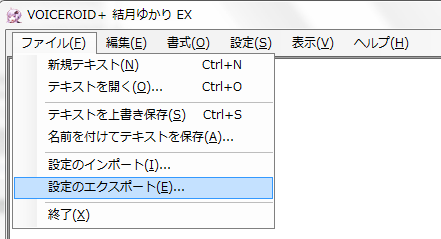 ボイスロイド上部メニュー「ファイル>設定のエクスポート」