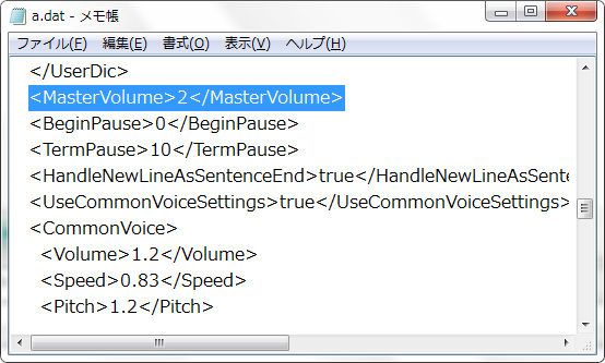 すると<MasterVolume>1</MasterVolume>という一行があるので「1」をもっと高い数値に書き変える。全角ではなく半角で入れよう。